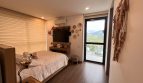 Distribución y características: 2 alcobas (alcoba principal con vestier doble, baño privado con division en vidrio templado,mueble de almacenamiento y espejo flotante, aire acondicionado, persianas y mueble para televisor);  baño social con división en vidirio templado, mueble de almacenamiento; Salón comedor con paredes texturizadas en madera, iluminación LED, lámparas decorativas, chimenea en uso, balcón en sala con vista panorámica al condominio (ideal para disfrutar el atardecer); balcón en alcoba principal con vista a la cordillera (perfecto para el amanecer); amplios ventanales que brindan excelente iluminación natural; persianas tipo blackout; cocina abierta integral con barra tipo americana;, gas domiciliario y calentador; zona de ropas independiente con tendedero; piso en tableta; puerta de ingreso automatizada con huella digital; 2 parqueaderos cubiertos (lineales), amplios y con espacio adicional para bicicletas, depósito cubierto de 4.5 m² con repisas para almacenamiento.